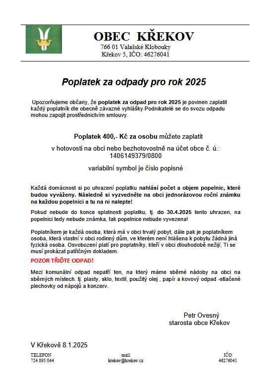 Poplatek 400 Kč za osobu můžete zaplatit v hotovosti na obci nebo bezhotovostně na účet obce č. ú.: 1406149379/0800